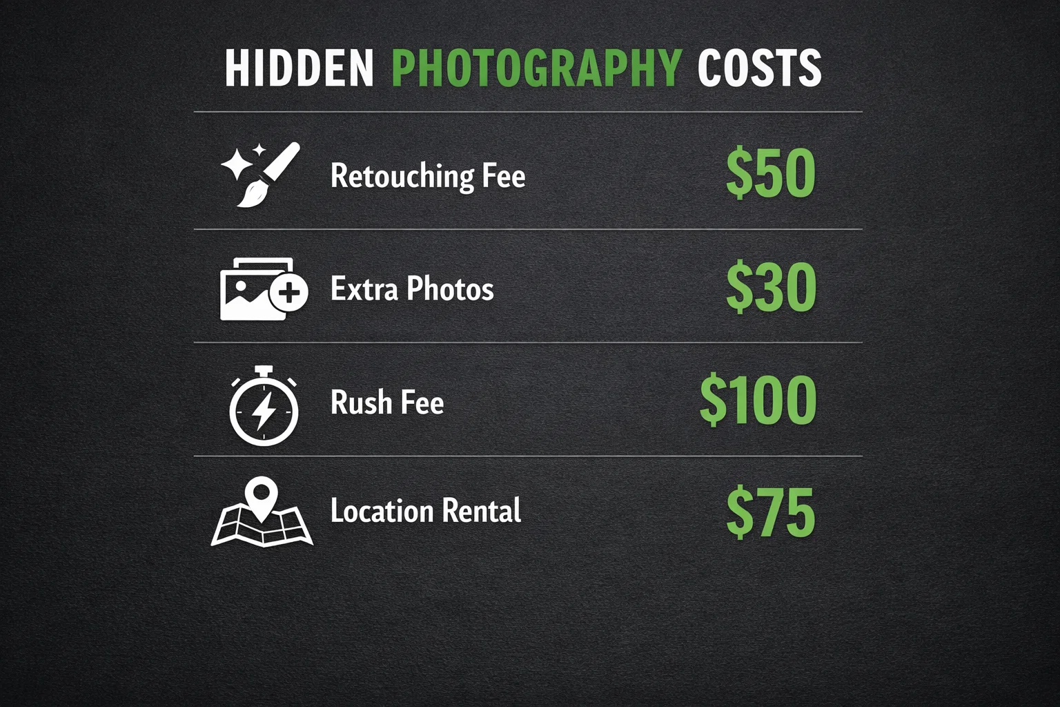 Watch out for: Retouching fees if not included, location fees for on-site shoots, rush delivery charges