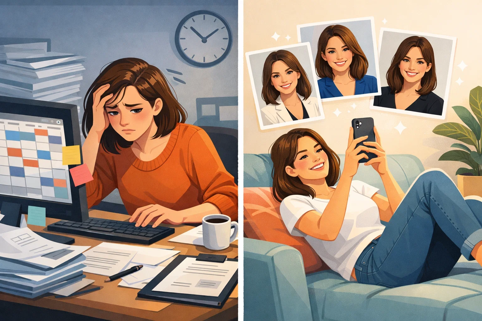 The advantage: Speed, cost, and flexibility. Need 10 different looks for 10 different platforms? Done in minutes. New haircut? Upload new selfies and regenerate. Need headshots by tomorrow? No problem.