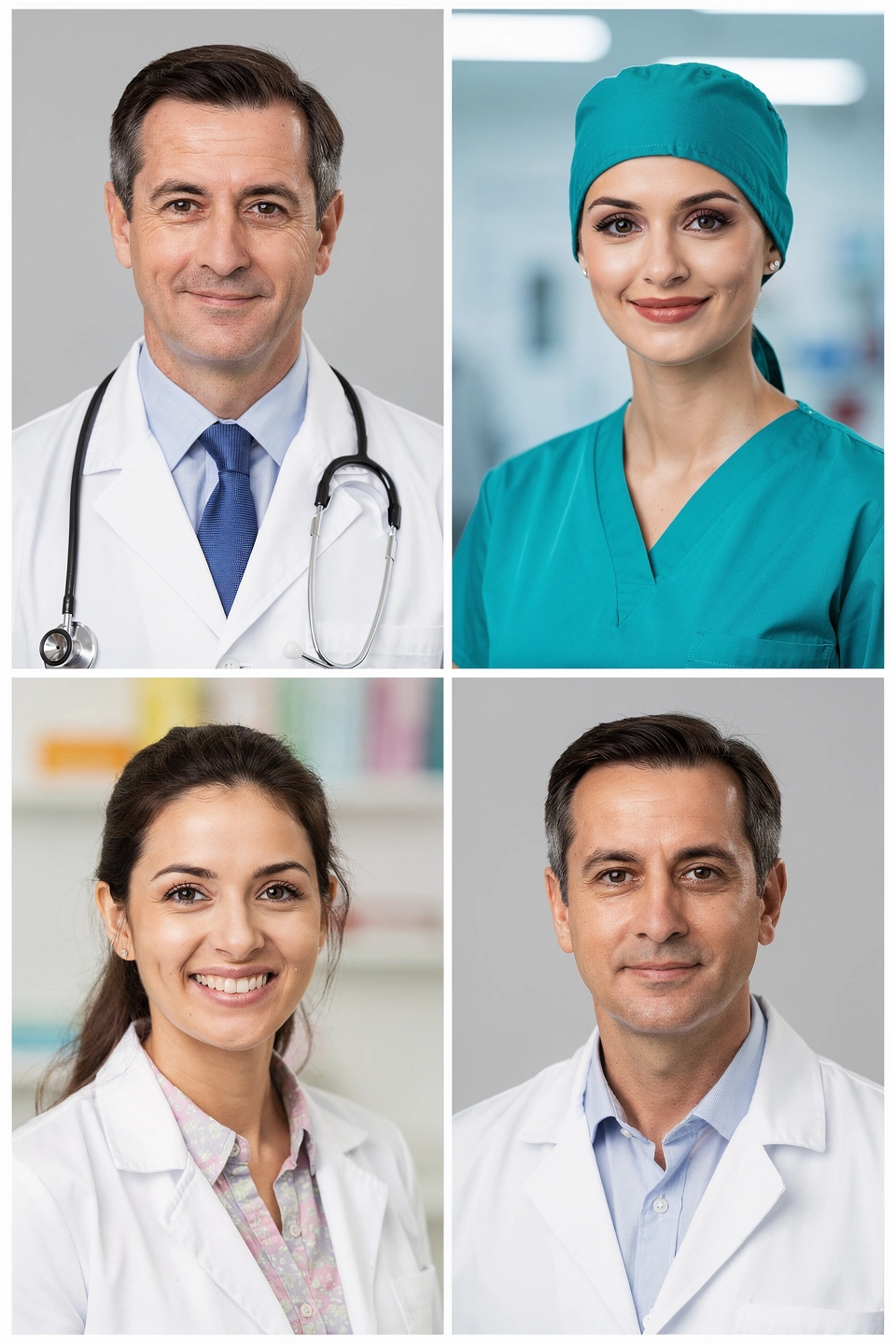 Background: Clean clinical setting (not too sterile), neutral gray, or soft gradient. Avoid anything that looks cold or intimidating.