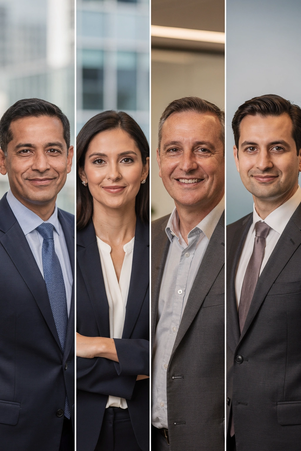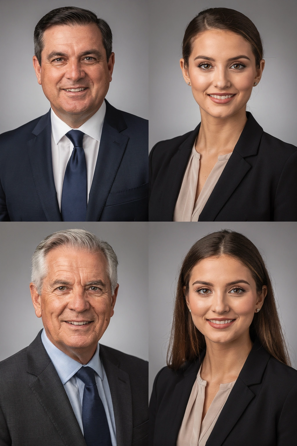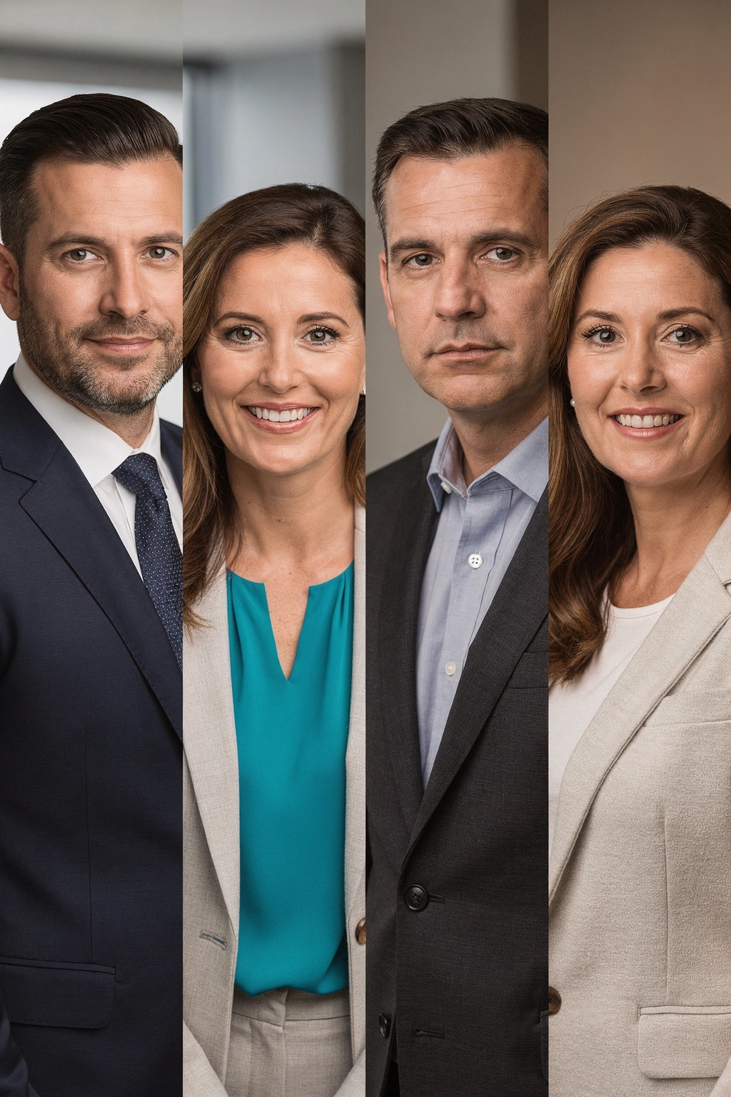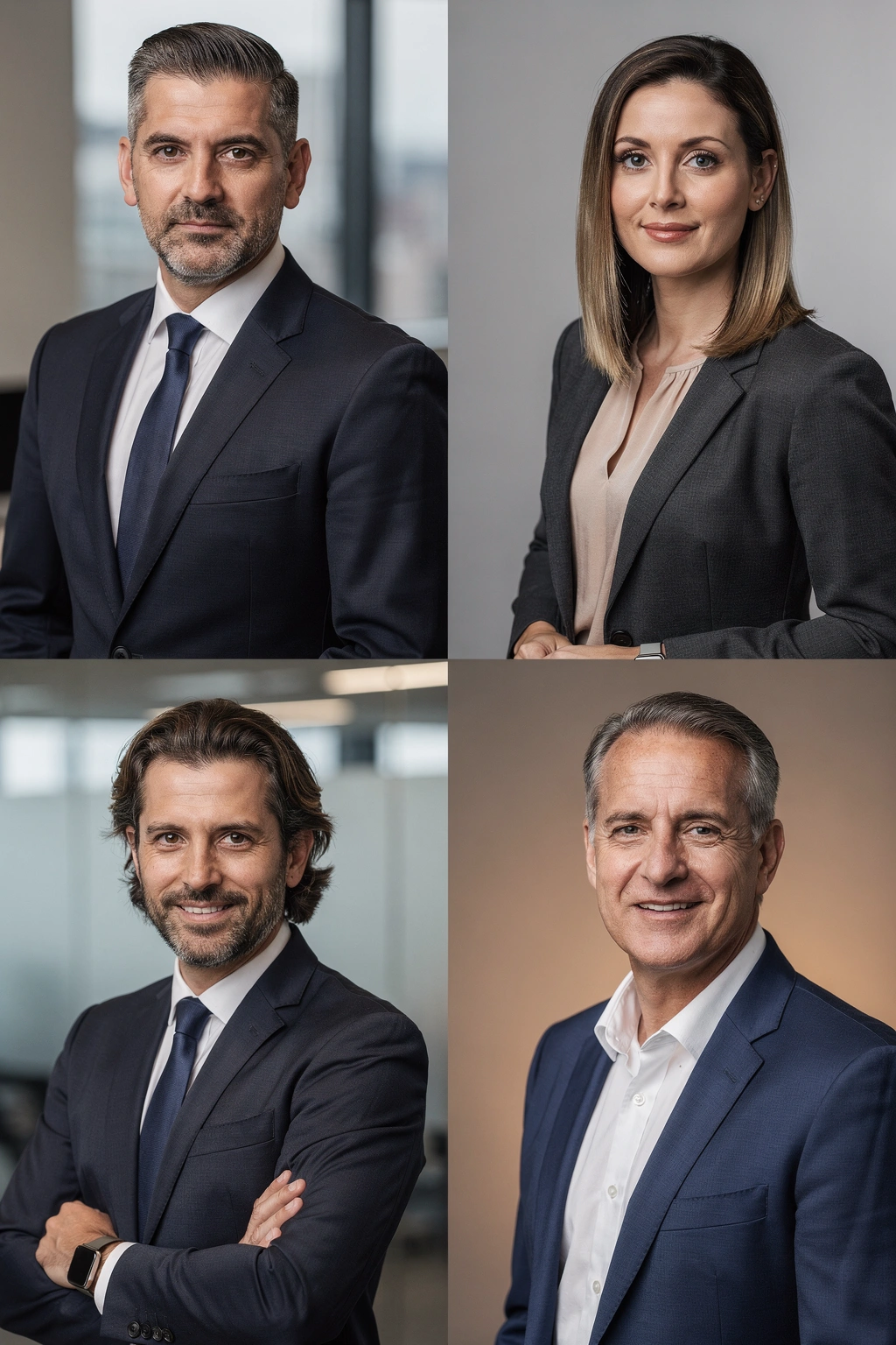 Background: Office settings, neutral studio, or subtle corporate environments. Consistency matters for team pages.